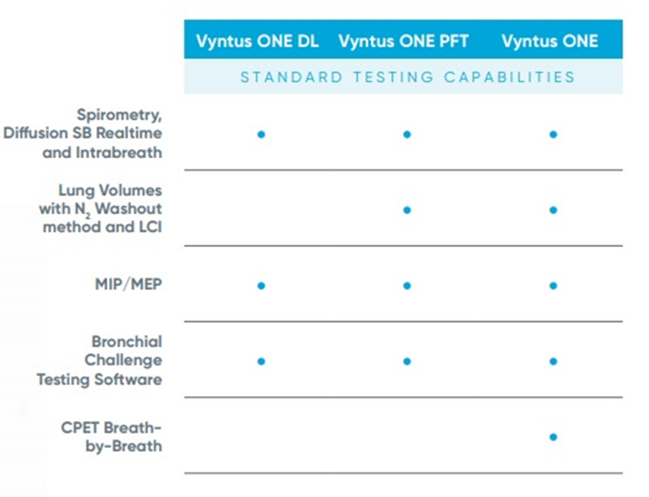 Vyntus One PFT sistemine isteğe bağlı, kardiyopulmoner egzersiz test sistemi (KPET), vücut pletismografi sistemi (Bodybox) ve bronkoprovakasyon testi daha sonrasında opsiyon olarak eklenebilir.
