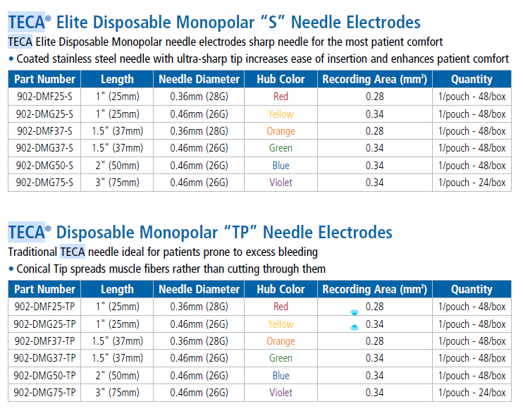 TECA Tek Kullanımlık Monopolar EMG İğne Elektrotları, elektromiyografi (EMG) ve sinir potansiyeli sinyalleri dahil olmak üzere biyopotansiyel sinyallerin uyarılması/kaydedilmesi için kayıt, izleme ve uyarı/kayıt ekipmanlarıyla birlikte kullanılmak üzere tasarlanmıştır.